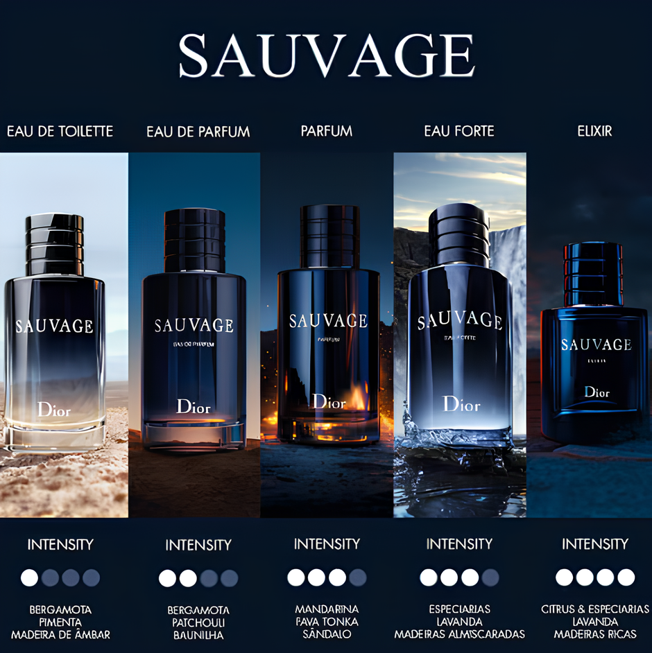 Sauvage Eau de Toilette: bergamota da Calábria, ambroxan, patchouli e notas ambarinas são os elementos que provocam o frescor e a sensação de liberdade por onde passa, sendo uma verdadeira declaração ao homem de espírito livre;